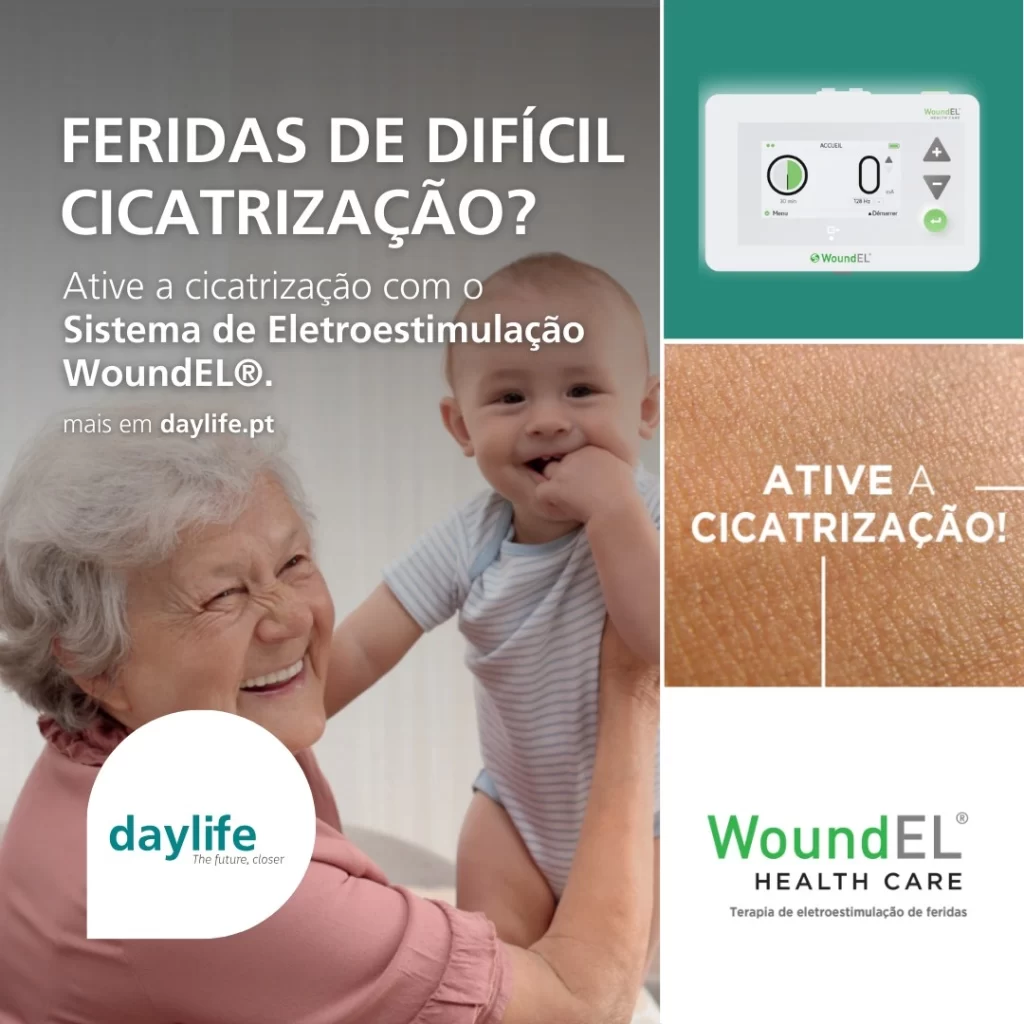 Active a cicatrização com o 𝗪𝗼𝘂𝗻𝗱𝗘𝗟®: um sistema de eletroestimulação projetado para impulsionar o processo de cicatrização e reduzir a dor relacionada com as feridas.